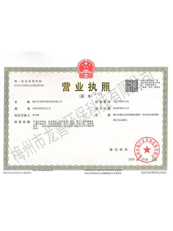 梅州市龍善環(huán)保科技有限公司為龍善環(huán)保股份有限公司(簡稱“龍善環(huán)保”)子公司。龍善環(huán)保于1995年12月成立,注冊資本為人民幣6,000萬元,總部位于深圳市南山區(qū)月亮灣大道2078號兆龍大樓16層。公司經(jīng)生態(tài)環(huán)境部、廣東省生態(tài)環(huán)境廳、深圳市生態(tài)環(huán)境局、深圳市交通運(yùn)輸委員會(huì)、深圳海事局等部門許可專業(yè)從事陸地和海洋環(huán)境保護(hù)產(chǎn)業(yè)的高科技民營企業(yè),主要經(jīng)營業(yè)務(wù)包括工業(yè)廢物收運(yùn)、資源化利用和無害化處理處置、海洋船舶污油水接收和集中處理處置、突發(fā)環(huán)境事故清污應(yīng)急處置等......